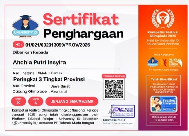 Ahdhia Pelajar SMAN 1 Ciomas Raih Prestasi Tingkat Provinsi di Bidang Akuntansi dan Ekonomi