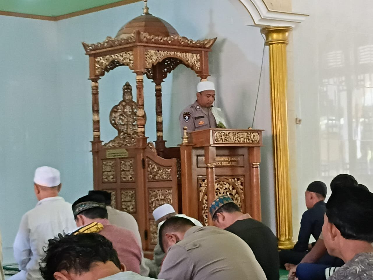 POLRES MELAWI Polda Kalbar Poskota Online – Aiptu Suwardi personel Polsek Ella Hilir Khotbah Jumat di Masjid Shirotull Jannah di lingkungan mako Polres Melawi dan petugas bilal dan Muadzin Bripka M.Nasran dari Satuan Samapta serta Imam Abah Elan Supriyatna, Jumat (1/8/25), Dalam khotbahnya Aiptu Suwardi mengangkat judul “Tiga Amalan Terbaik Menuju Kampung Akhirat”.