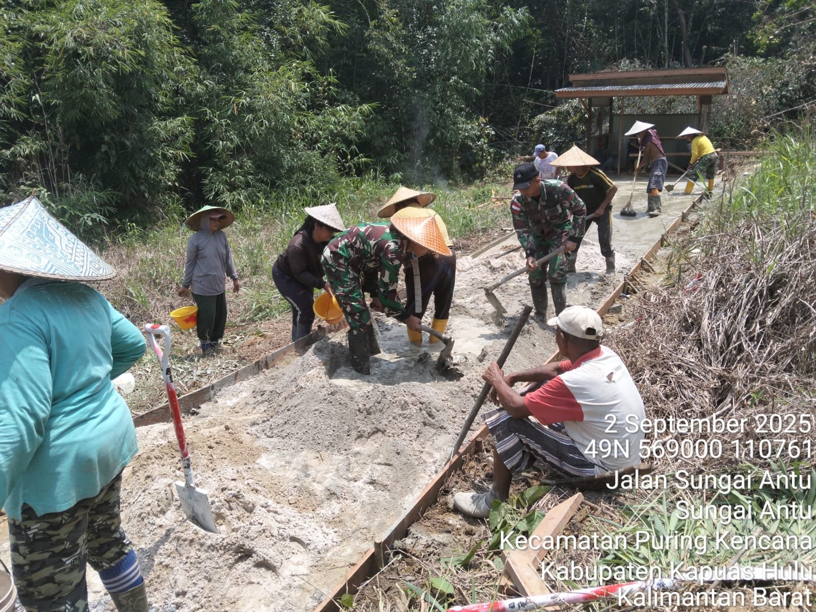 Personel Pos Pamtas Sei Mawang sambil menyampaikan komunikasi tampak semangat bergotongroyong dengan mengecor masyarakat jalan setapak menuju areal pemakaman. Masyarakat Sei Mawang terbantu dengan kehadiran TNI di wilayahnya.