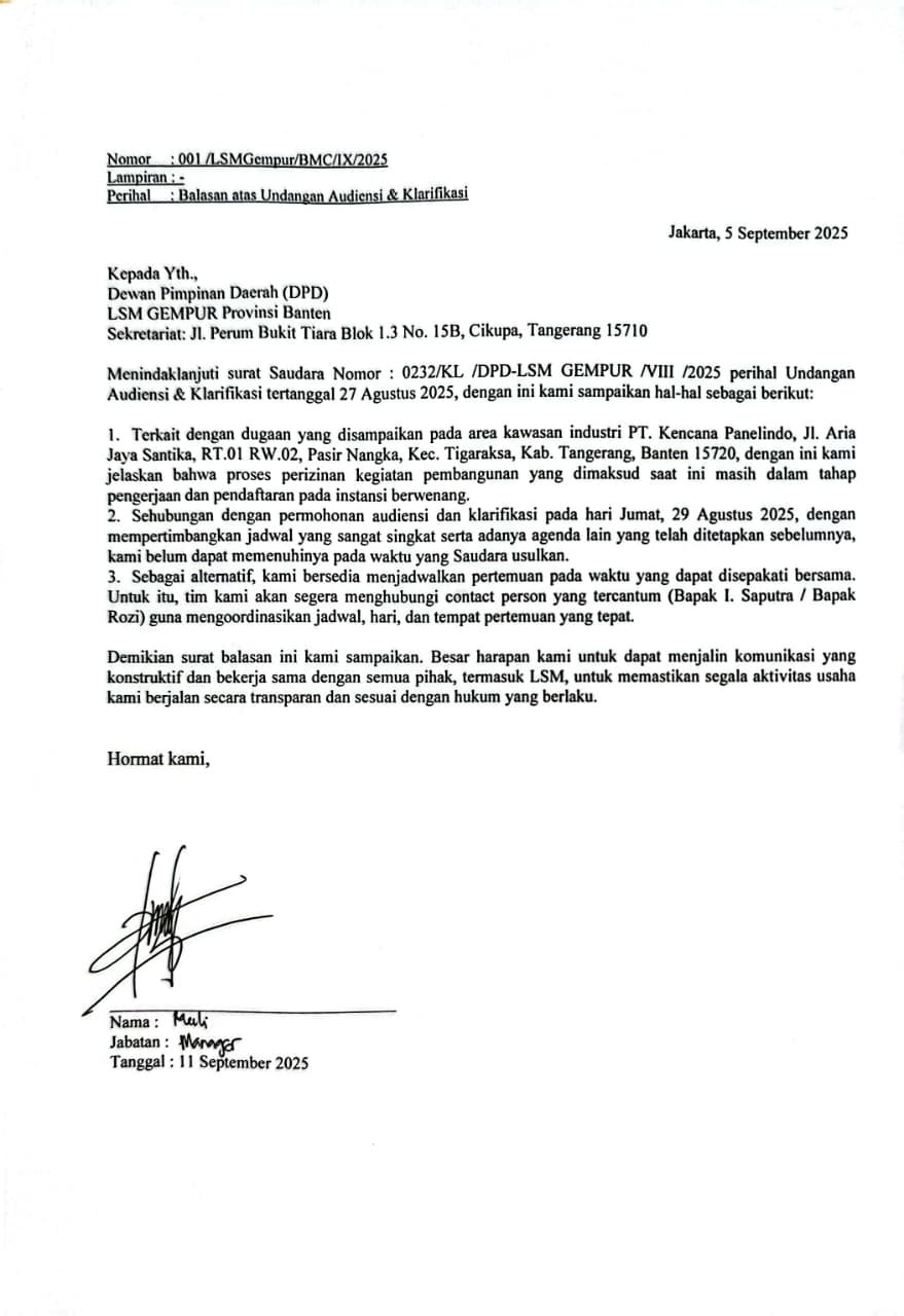 “Kami tidak ingin marwah kabupaten Tangerang di rendahkan oleh oknum-oknum yang tidak patuh atas peraturan perundang-undangan yang ada, dan kami meminta kepada pemerintah kabupaten Tangerang melalui Dinas Tata Ruang dan Bangunan serta Satuan Polisi Pamong Praja, untuk menindak tegas atas temuan kami ini, agar tidak menjadi preseden buruk di kemudian hari. Kami akan layangkan surat segera agar ada efek jera dan perhatian khusus atas sikap arogansi perusahaan.” Tutup Ilham Saputra.