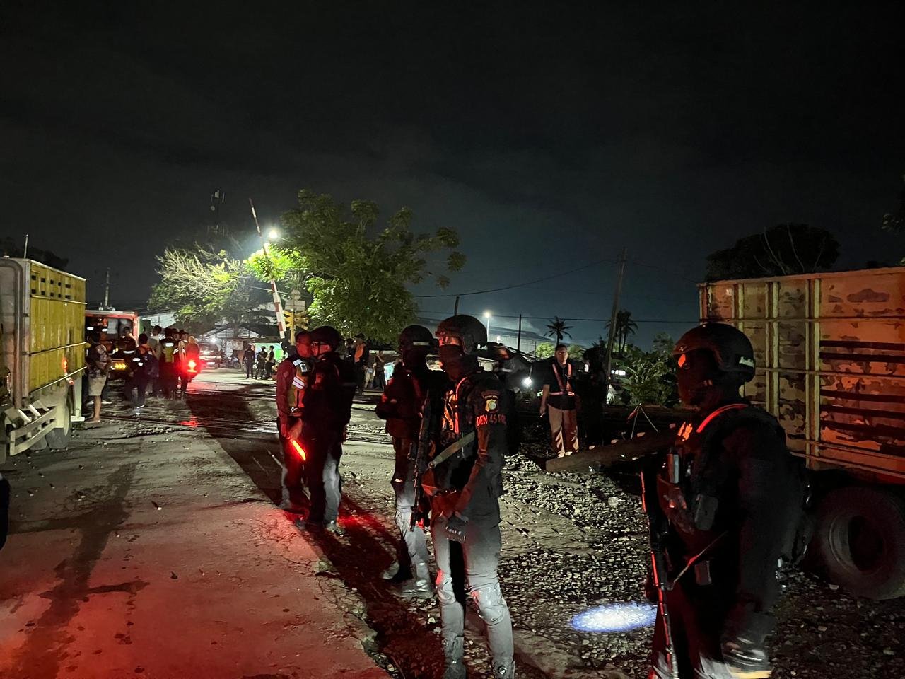 Personel Brimob tiba di lokasi sekitar pukul 20.15 WIB dan langsung berkoordinasi dengan pihak PT Kereta Api Indonesia (KAI), kepolisian setempat, serta instansi terkait lainnya. Mereka kemudian melakukan pengaturan arus lalu lintas di sekitar lintasan yang terdampak akibat dua gerbong bagian belakang kereta yang anjlok.