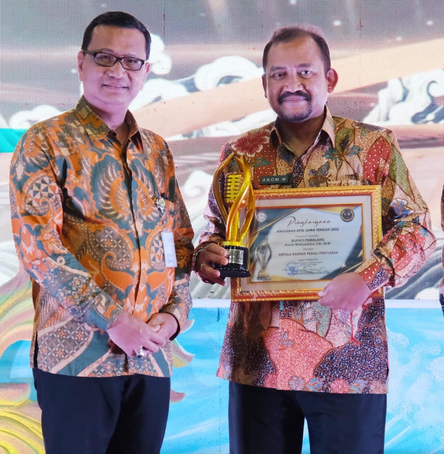 Jepara – Bupati Pemalang Anom Widiyantoro meraih penghargaan Kepala Daerah Peduli Penyiaran dalam ajang Anugerah Komisi Penyiaran Informasi Daerah (KPID) Jawa Tengah 2025 yang digelar di Pendopo Kartini Kabupaten Jepara, Jumat (31/10/2025).