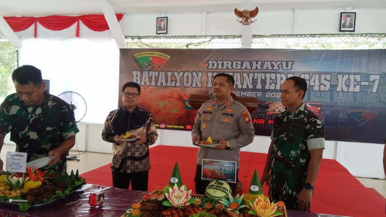 Sambas Poskota Online – Komandan Kodim 1208/Sambas Letkol Inf Dwiyanto Kusumo M. A. P menghadiri kegiatan peringatan Hari Ulang Tahun (HUT) ke-7 Batalyon Infanteri 645/Garda Tama Yudha (Yonif 645/GTY) yang berlangsung khidmat dan penuh semangat kebersamaan yang digelar di Mayonif 645/Gty, Desa Saing Rambi, Kec. Sambas, Kab. Sambas, (06/12/25).