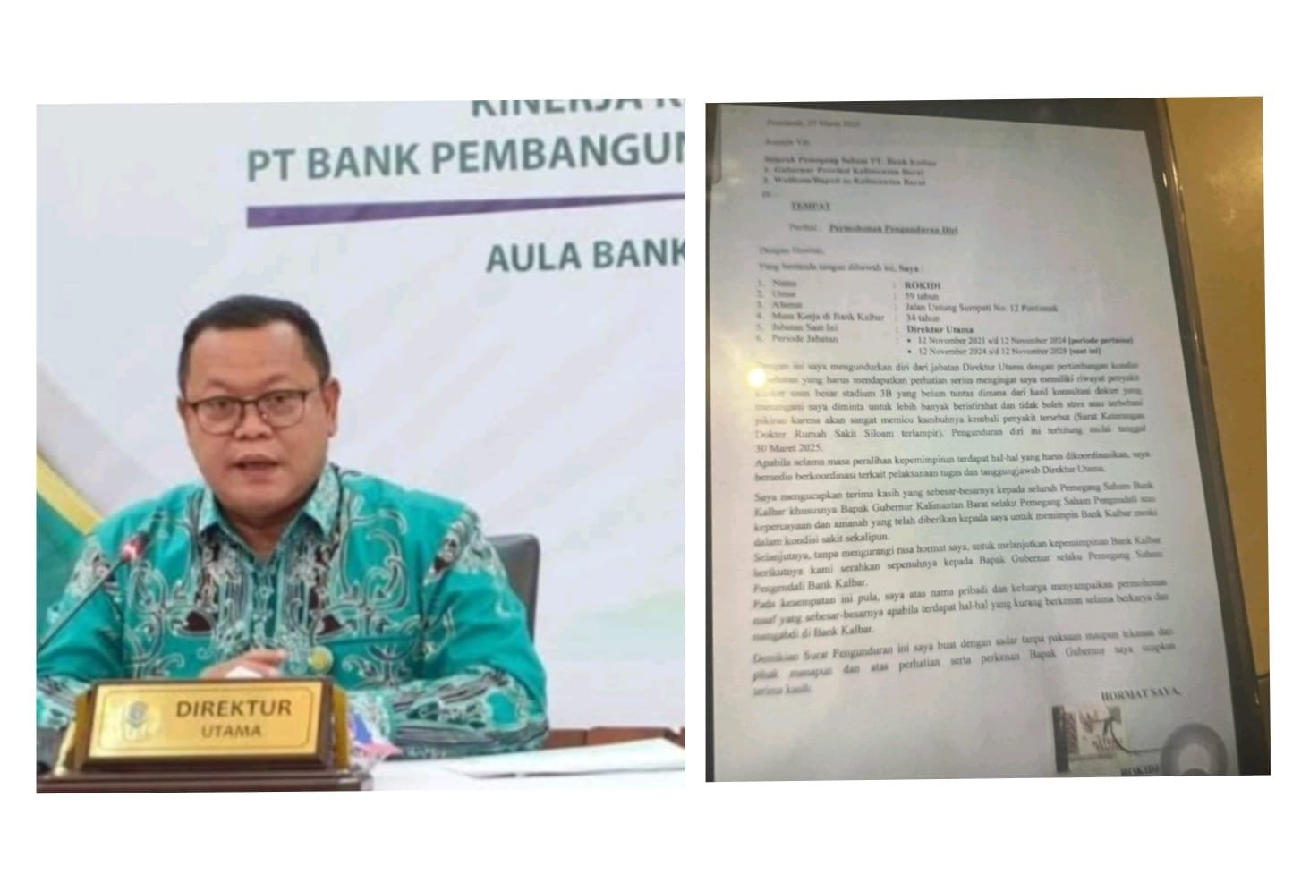 Direktur Utama PT. Bank Pembangunan Daerah Kalimantan Barat (Bank Kalbar), Rokidi, secara mendadak mengundurkan diri dari jabatannya. Informasi ini mencuat ke publik setelah beredarnya foto surat pengunduran diri yang tersebar melalui aplikasi WhatsApp di kalangan pegawai aktif dan pensiunan Bank Kalbar,Senin 7 April 2025.