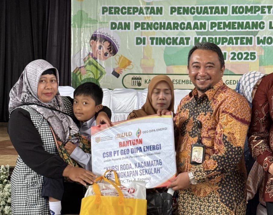 Bantuan bagi 45 siswa penyandang disabilitas serta siswa dari keluarga kurang mampu dan rentan putus sekolah ini diberikan secara simbolis oleh Wakil Bupati Wonosobo, Amir Husain, bersama HCF Manager PT Geo Dipa Energi (Persero) Unit Dieng Ahmad Riyan Suryansyah kepda 4 perwakilan siswa pada acara gebyar apresiasi Pemkab Wonosobo yang digelar di Gedung Adipura Wonosobo, Kamis, (11 /12/2025 ).