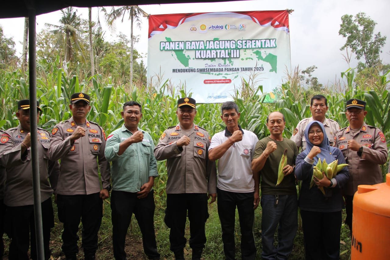Kegiatan ditutup dengan panen jagung serentak di lokasi, disertai penyaluran bantuan sosial serta penyediaan sarana pendukung pertanian, sebagai langkah nyata mendukung kemandirian pangan nasional.