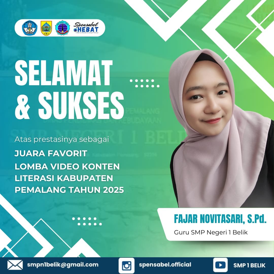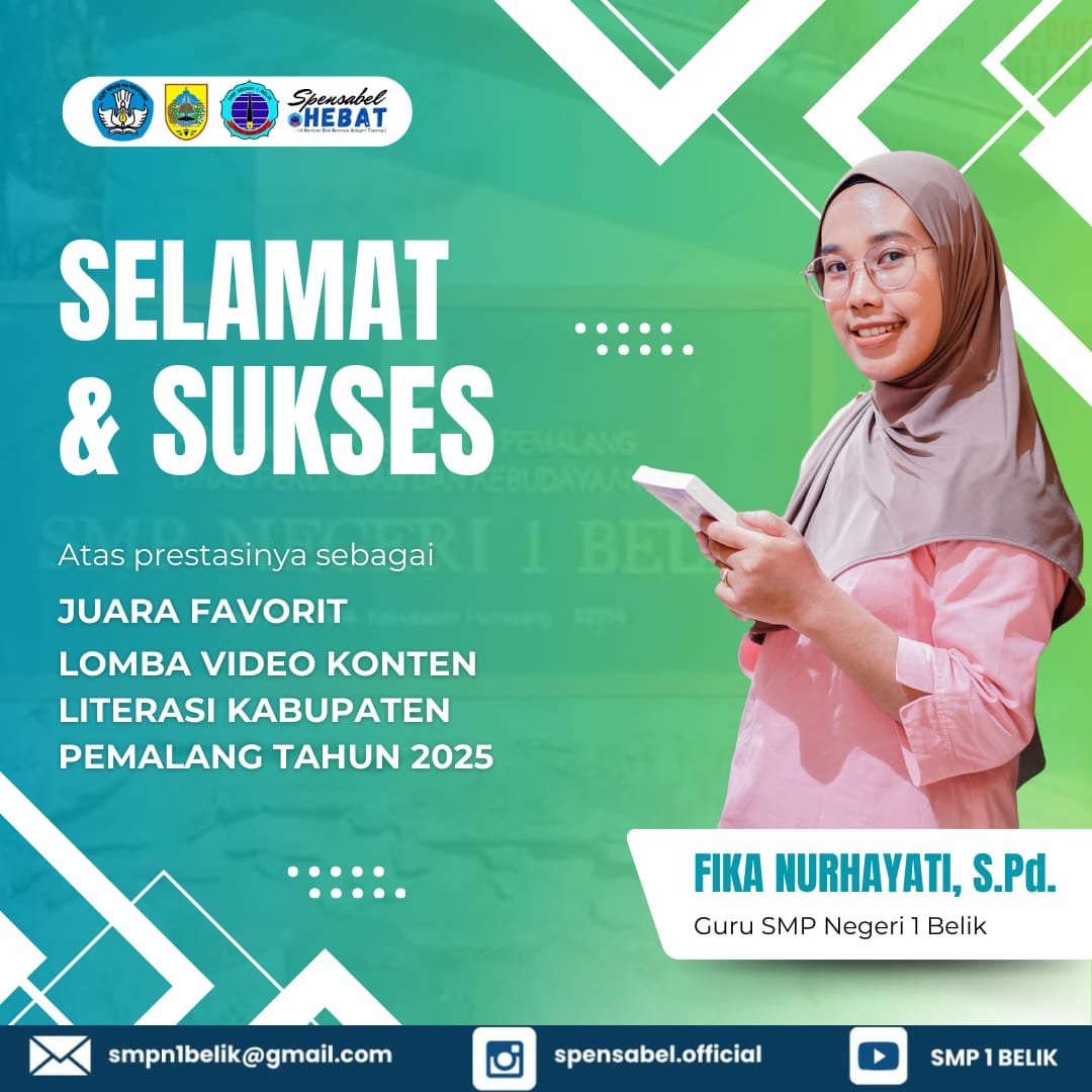 Dan disini di Kabupaten Pemalang yang masuk dalam Provinsi Jawa Tengah ada dua guru perempuan dari SMPN 1 Belik yakni ,Fika Nurhayati , S.Pd. guru mapel IPS dan Fajar Novitasari , S.Pd.guru mapel Matematika telah menorehkan nama mereka sebagai Juara Favourite lomba Video Konten Literasi .