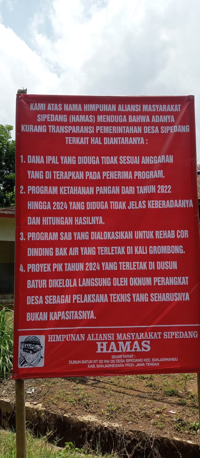 Sejumlah warga Desa Sipedang yang tergabung dalam Himpunan Aliansi Masyarakat Sipedang (HAMAS) menyuarakan aspirasi mereka terkait dugaan kurangnya transparansi dalam pelaksanaan sejumlah program pembangunan desa. Aspirasi tersebut disampaikan melalui pemasangan spanduk protes di beberapa titik wilayah desa.
