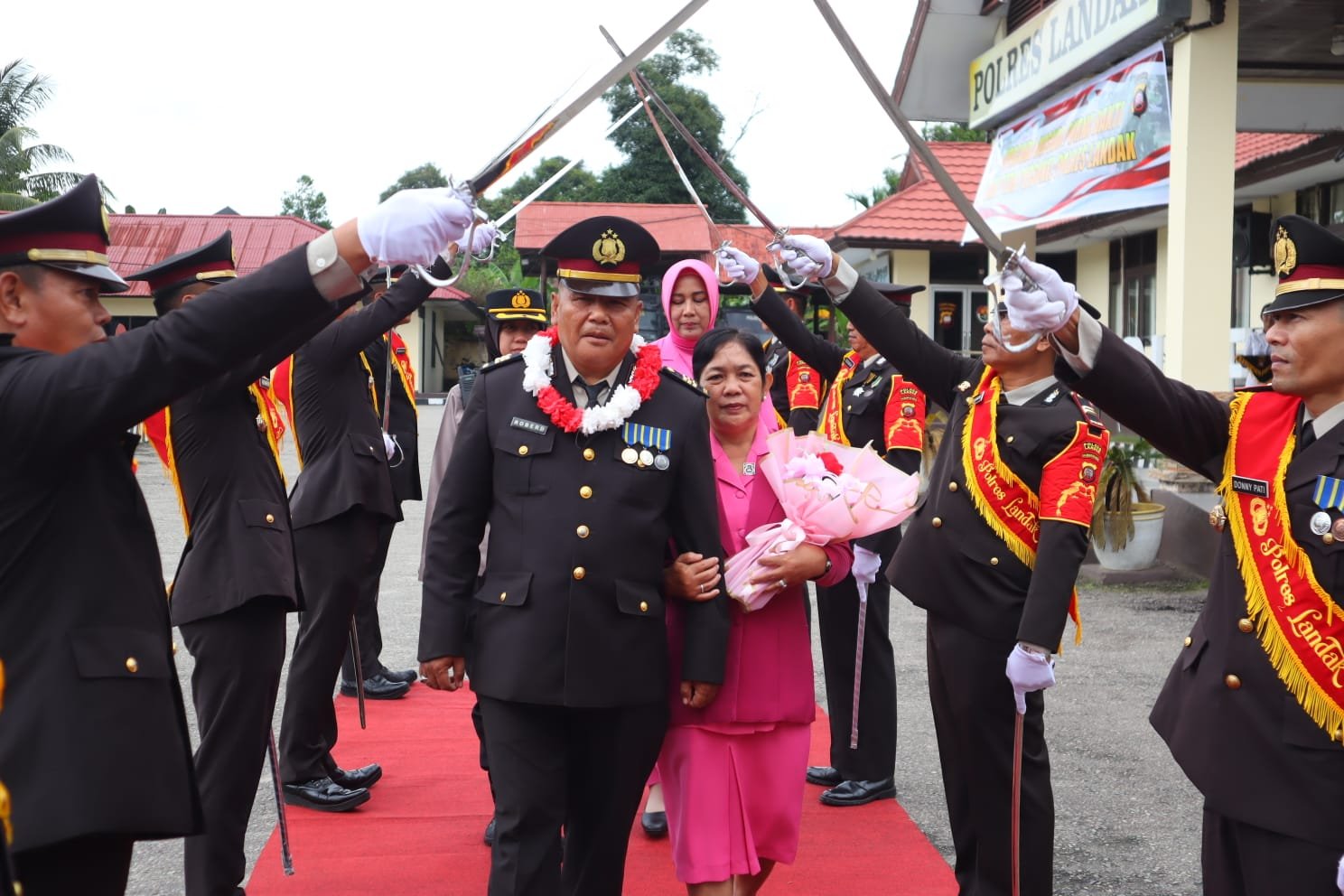 Upacara dimulai dengan tradisi pedang pora, dimana pejabat yang purna tugas didampingi istri berjalan di bawah iringan pedang yang terhunus tinggi oleh para perwira. Sorak hangat dan tepuk tangan dari personel Polres Landak menambah khidmat momen tersebut.Hadir dalam kegiatan tersebut Waka Polres Landak Kompol Syaiful Bahri, S.Ip., M.Sos., para Pejabat Utama (PJU) Polres Landak, seluruh personel Polres Landak, Bhayangkari Cabang Landak