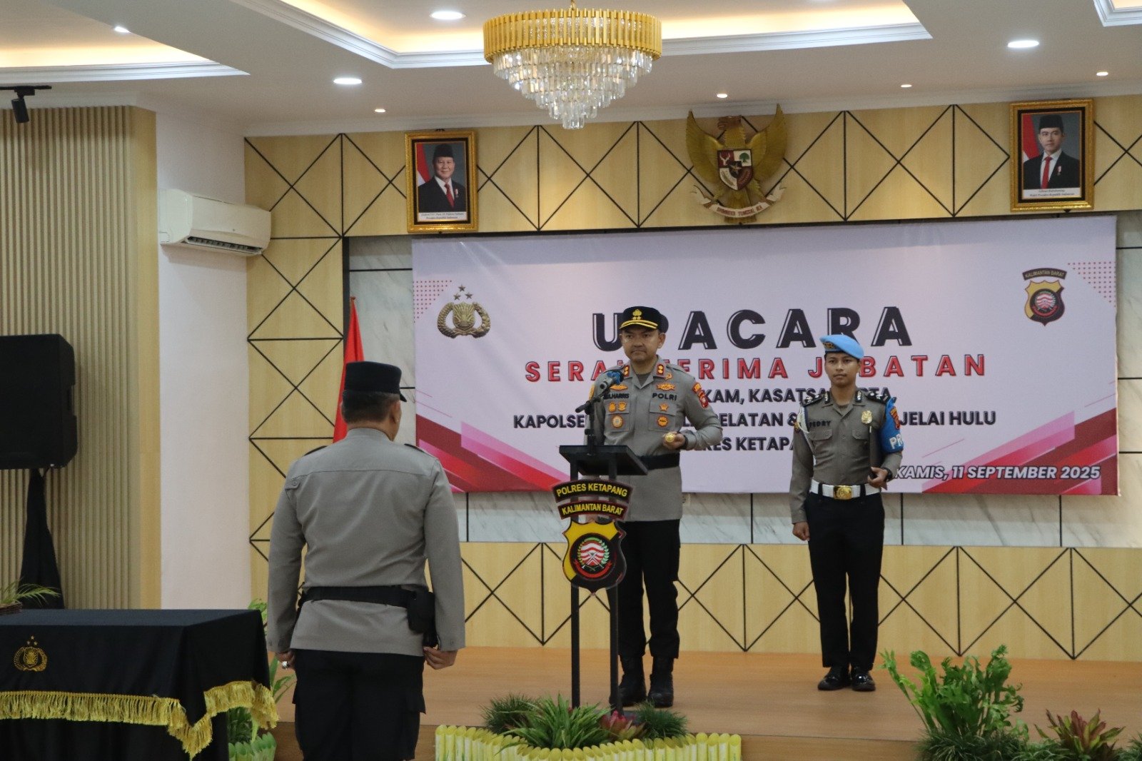 KETAPANG, POLDA KALBAR, Poskota Online – Kapolres Ketapang, AKBP Muhammad Harris, S.H., S.I.K., M.I.K., CPHR., memimpin upacara serah terima jabatan (sertijab) Kasat Samapta, Kasat Intelkam, Kapolsek Matan Hilir Selatan dan Kapolsek Jelai Hulu. Upacara sertijab tersebut digelar di Aula Mapolres Ketapang di Jalan Brigjend Katamso Nomor 01 Ketapang, Kamis pagi (11/09/2025).
