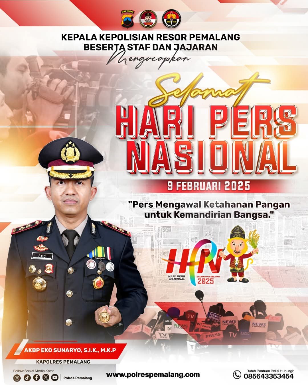 “Selamat Hari Pers ke-79, semoga pers Indonesia semakin maju dan profesional dalam menjalankan tugasnya. Mari bersama-sama kita jaga keamanan dan ketertiban di Kabupaten Pemalang ujar AKBP Eko Sunaryo,SH .SIK