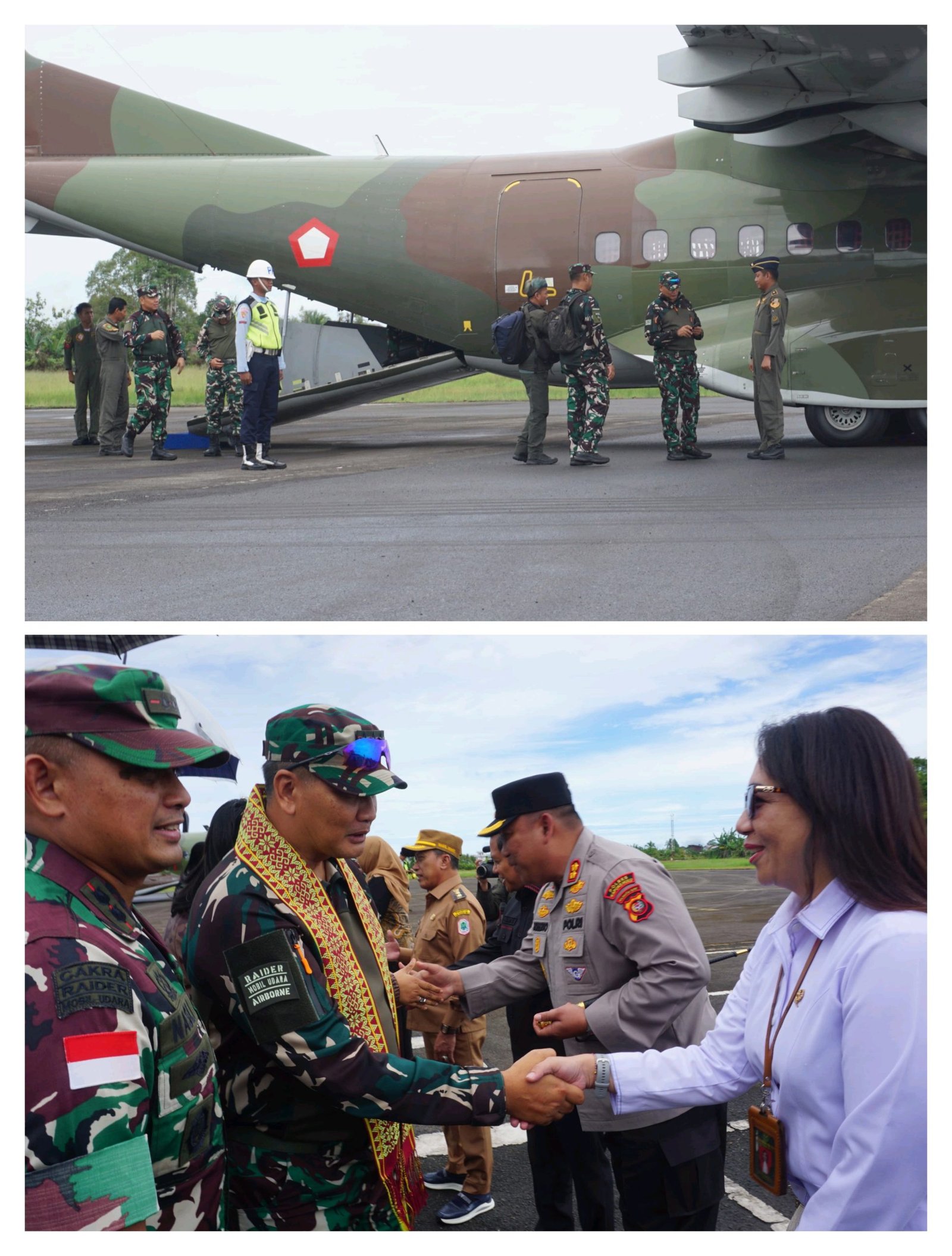 Turut menyambut, Kapoksahli Pangdam XII/Tpr, Brigjen TNI Nursamsyudin, Danrem 121/Abw, Brigjen TNI Purnomosidi, S.I.P., M.A.P., M.Han., Dandim 1206/Putussibau, Letkol Inf Nasli, S.Sos., dan unsur pejabat Forkopimda Kabupaten Kapuas Hulu.