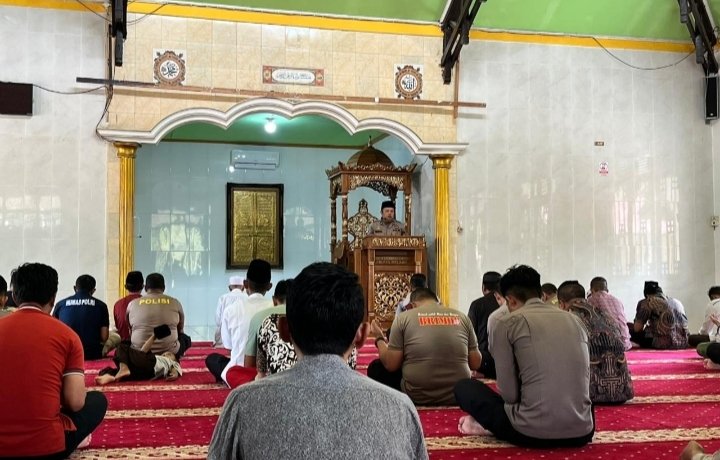 Polres Melawi Polda Kalbar Poskota Online– Suasana khusyuk menyelimuti pelaksanaan Sholat Jumat di Masjid Shirotul Jannah, Jumat (hari ini), saat Aipda Hendra dipercaya menjadi khotib di hadapan para jamaah.
