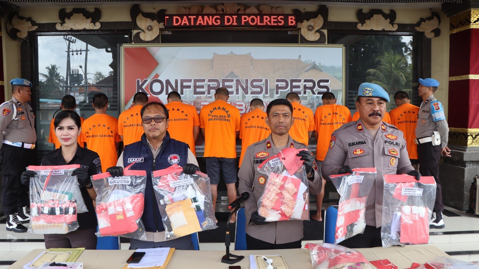 Dalam pemaparannya, Wakapolres menyebut para tersangka berinisial AAP, DPA, CARMA, MS, MAYP, MOA, HLD, IKAS, TS, dan DRW. Mereka rata-rata berusia 20–30 tahun. Dari tangan para tersangka, petugas menyita barang bukti berupa 394,59 gram sabu, 30,09 gram ganja, dan 872 butir ekstasi.