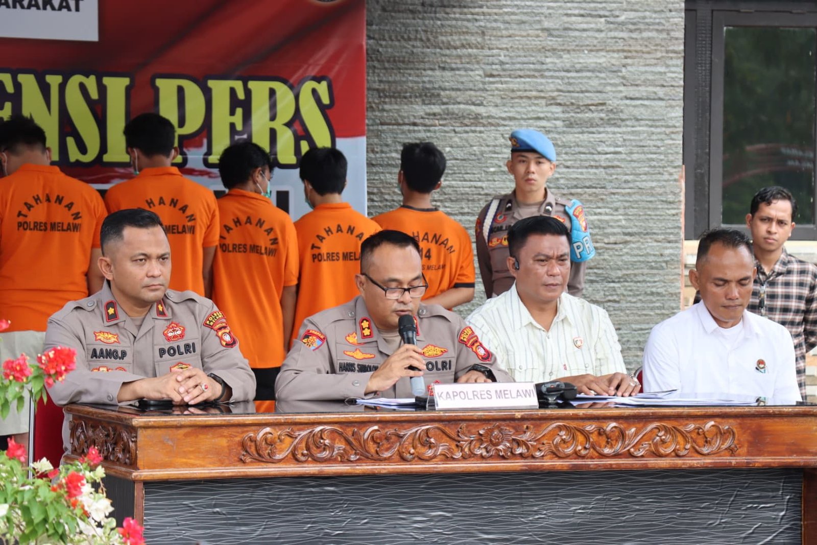 Polres Melawi Polda Kalbar Poskota.Online- Konferensi Pers Polres Melawi di pimpin langsung Kapolres Melawi Polda Kalbar AKBP Harris Batara Simbolon, S.I.K., S.H., M.Tr.Opsla di damping Waka Polres Kompol Aang Permana, S.I.P., S.H., M.A.P, Kasat Reskrim Ambril, S.H., M.A.P., Kasat Narkoba AKP Dhanie Sukmo Widodo di Polres Melawi, Selasa (27/5/25).