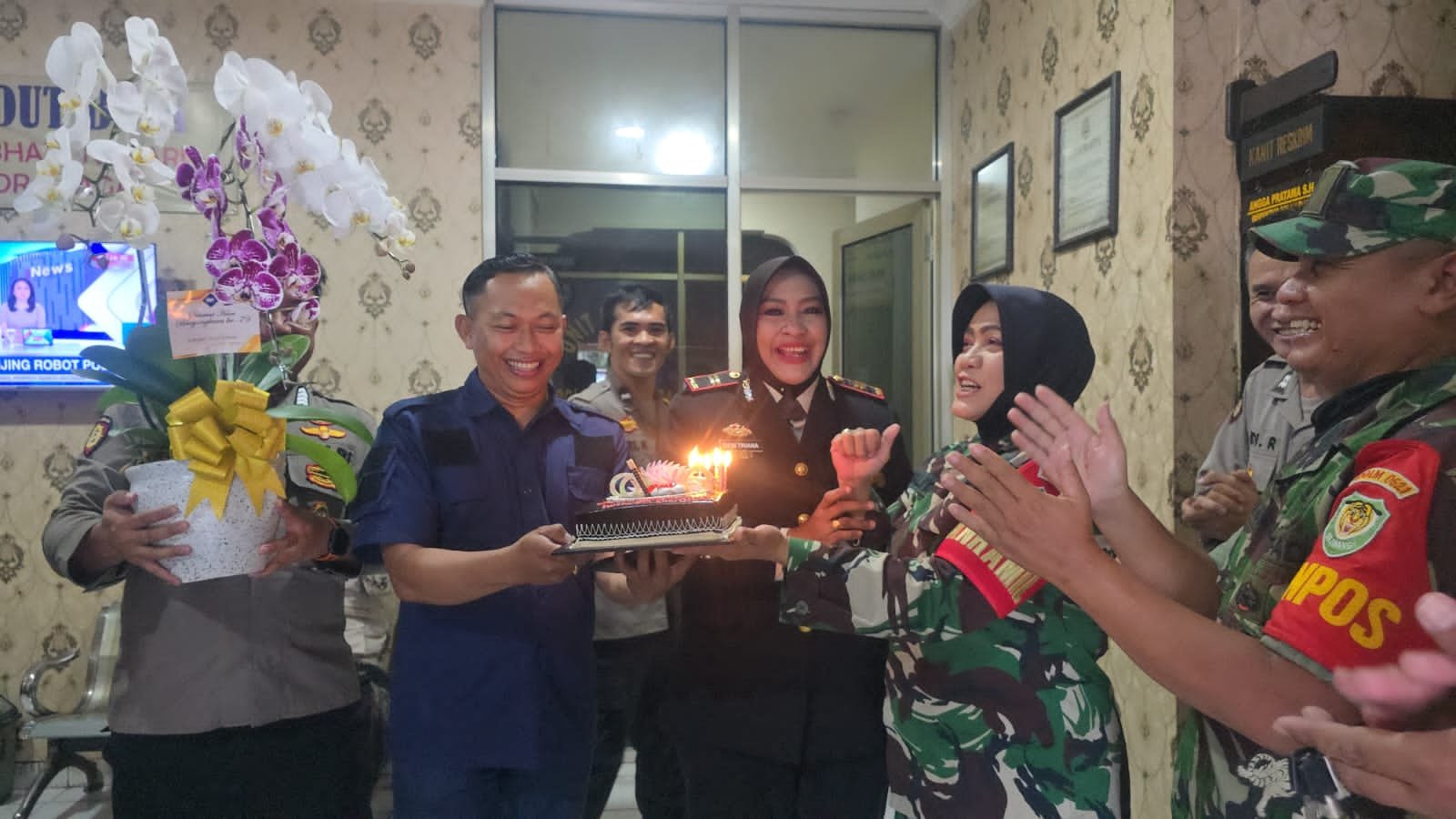 Dalam kunjungan tersebut dimana Danramil Beserta Anggota Danramil 0621-13 Ciomas membawakan Kue Ulang Tahun dan karangan bunga Anggrek yang langsung diberikan kepada Kapolsek Dramaga Iptu Desi Triana,S.H,.M.H, dan meniup lilin kue ulang tahun secara bersama – sama.