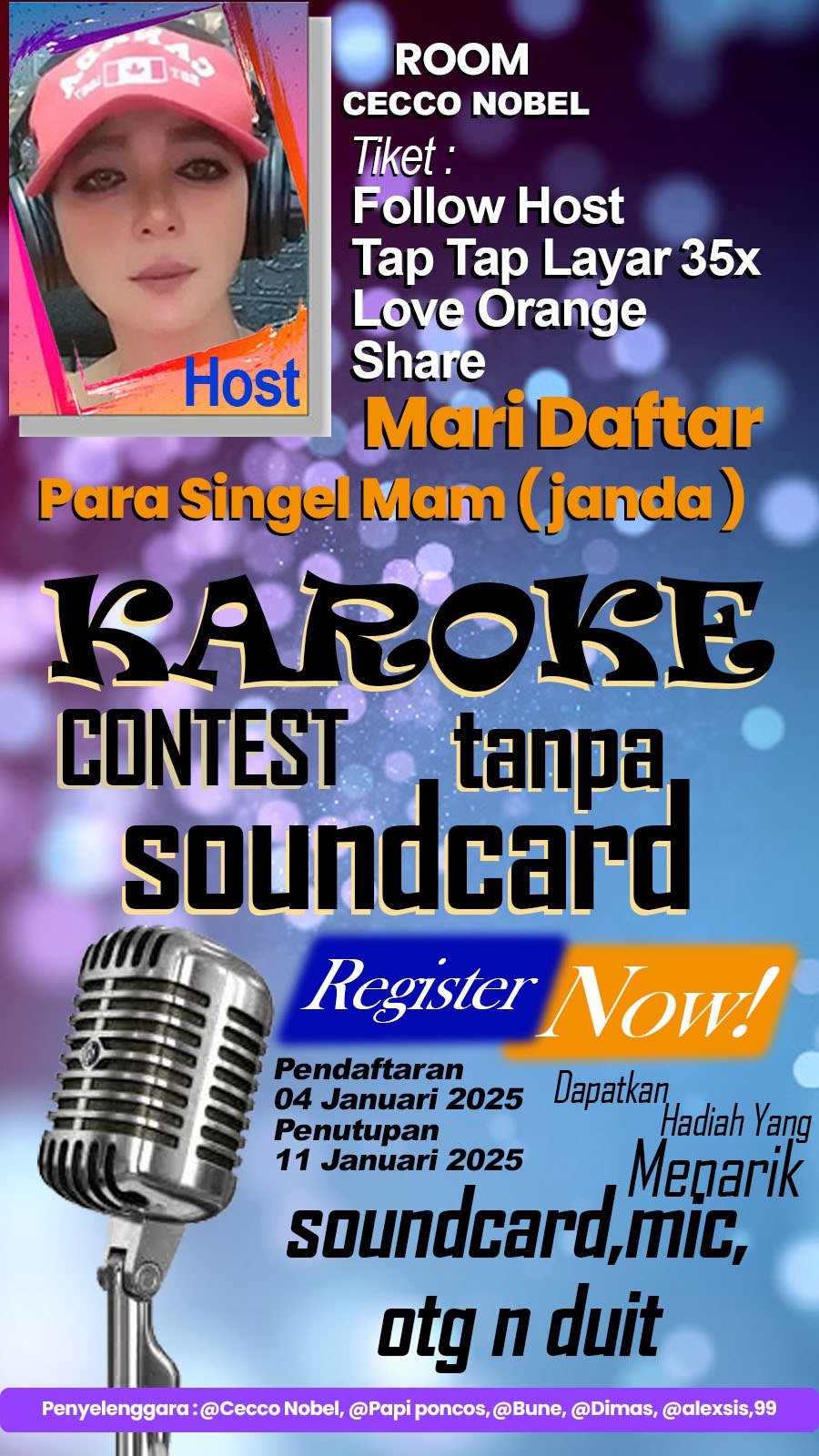“Saya berterimakasih sekali dengan kak host dengan nama akun @cecconobel yang memiliki semangat dan memberikan support kepada single mom terutama saya. Saya belajar dengan kak host @cecconobel yang sangat mengasihi adiknya yang dalam kelemahan nya melawan penyakit, beliau tetap memberikan support terhadap adiknya dan untuk para single mom yang berjuang demi anak-anak nya. Program acara yang sudah berlangsung dari sejak tanggal 05 Januari 2025 di room tik tok nya kak @cecconobel46. Saya belajar kepada kak host @cecconobel mengenai kasih terhadap adiknya dan kami termasuk saya sebagai single mom” Ucap peserta lomba karaoke tanpa soundcard dari Indramayu yang memiliki akun @marchella060.”