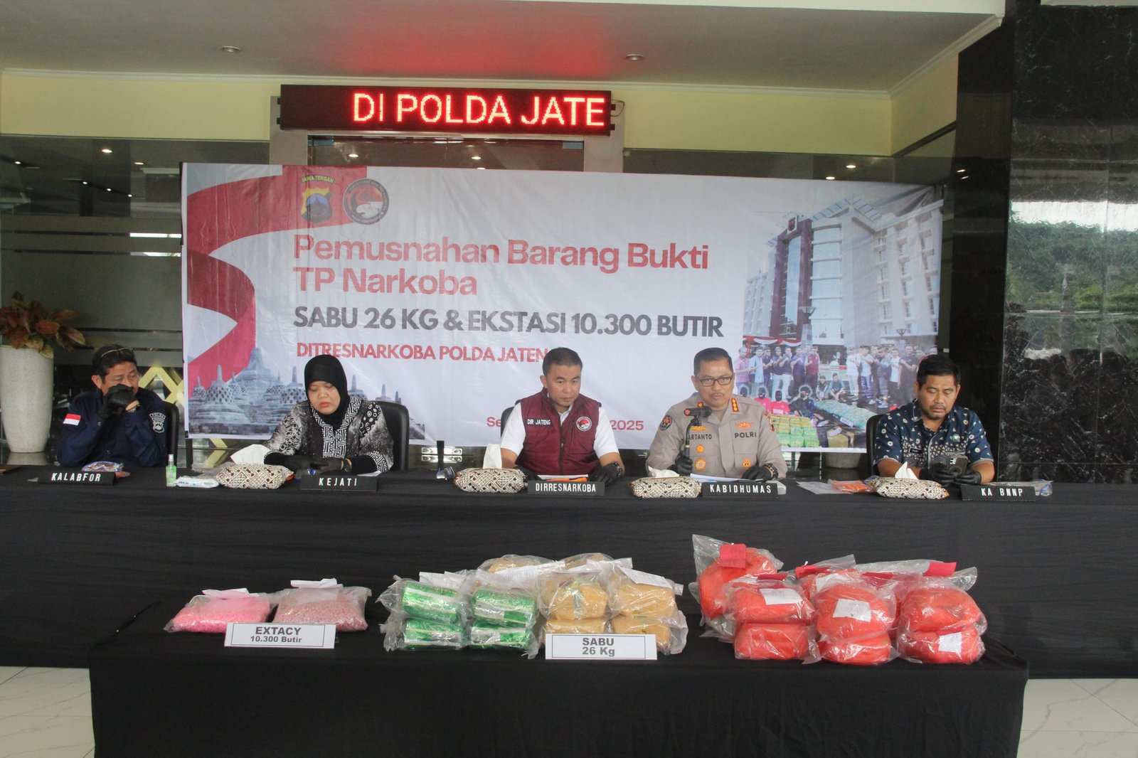 Dalam kegiatan itu, barang bukti yang dimusnahkan terdiri dari 26 kilogram sabu dan 10.300 butir pil ekstasi dengan total nilai mencapai Rp 31,15 miliar. Barang bukti tersebut merupakan hasil pengungkapan dua kasus narkotika sepanjang Januari hingga Februari 2025, yang turut mengamankan empat tersangka berinisial RT, MIA, SN, dan HS.