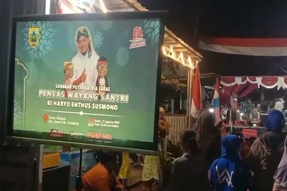 Pemalang, jongjava.co – Suasana meriah menyelimuti Dusun Klarasan, Desa Taman, Kecamatan Taman, Kabupaten Pemalang, Kamis (21/8/2025) malam. Ratusan warga tumpah ruah di Jalan Pergiwo untuk menyaksikan Pagelaran Wayang Santri dalam rangka memperingati HUT RI ke-80.