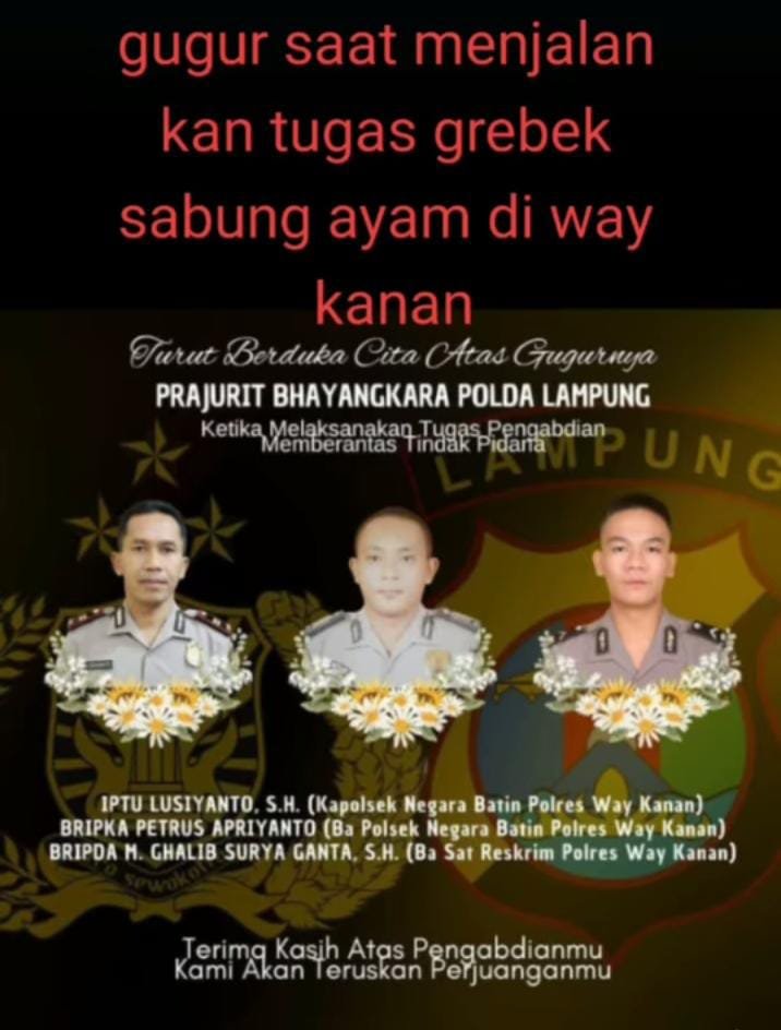 “Benar terjadi peristiwa penembakan saat penggerebekan. Sebanyak 17 personel Polri dari Polres Way Kanan mendatangi lokasi sabung ayam, tetapi mereka diserang dengan tembakan oleh pihak yang tidak dikenal. Akibatnya, tiga anggota kami gugur dalam tugas,” tegas Kabid Humas Polda Lampung, Kombes Yuni.