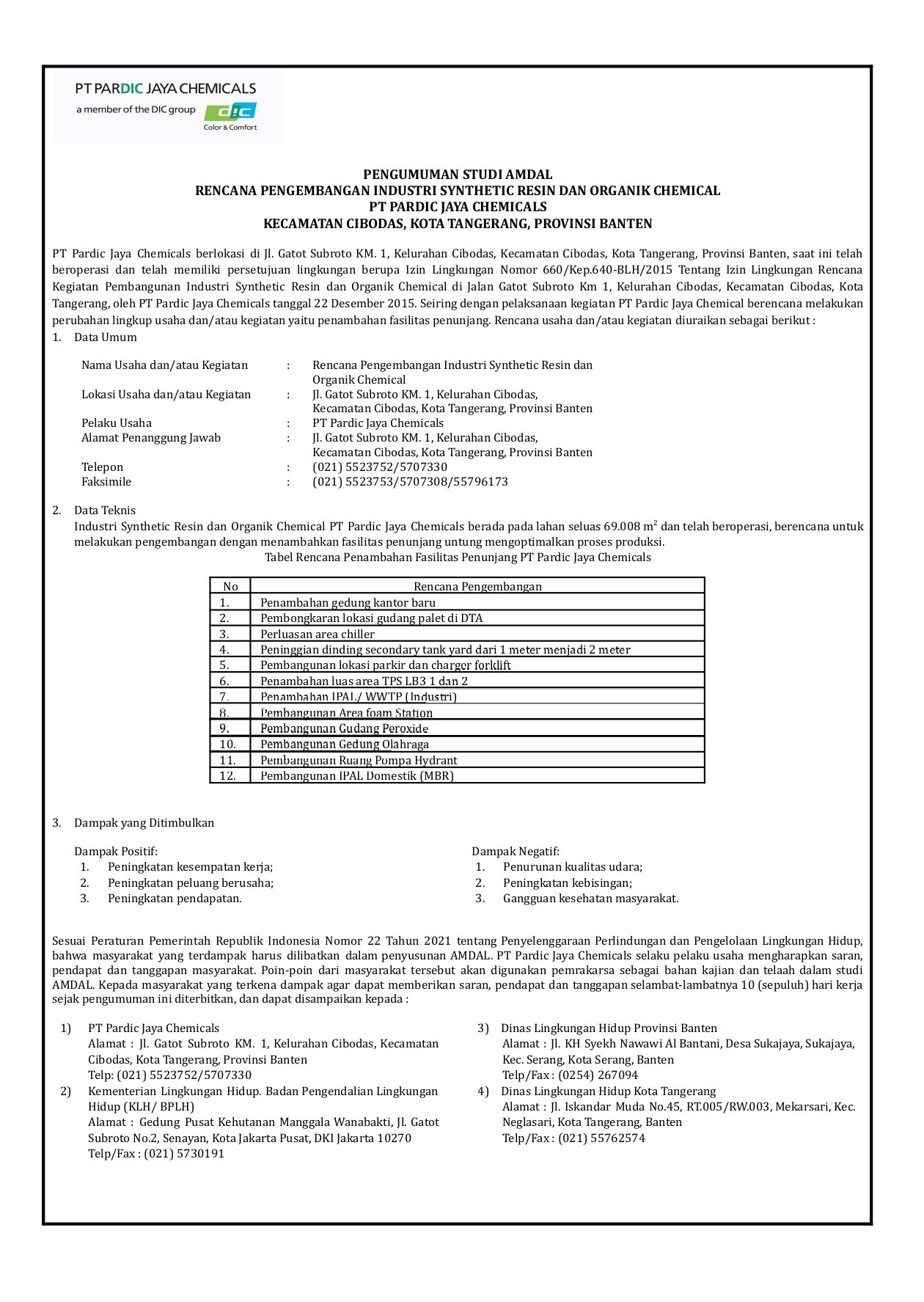Pengumuman Study AMDAL PT. PARDIC JAYA CHEMICALS