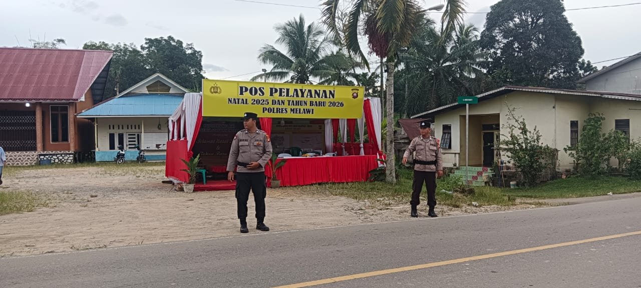 Polres Melawi Polda Kalbar Poskota Online– Personel Pos Pelayanan Operasi Lilin Kapuas 2025 Polres Melawi yang bertugas di Desa Batu Buil melaksanakan pengaturan arus lalu lintas sekaligus memberikan pelayanan humanis kepada masyarakat yang melintas, Sabtu (20/12/2025).