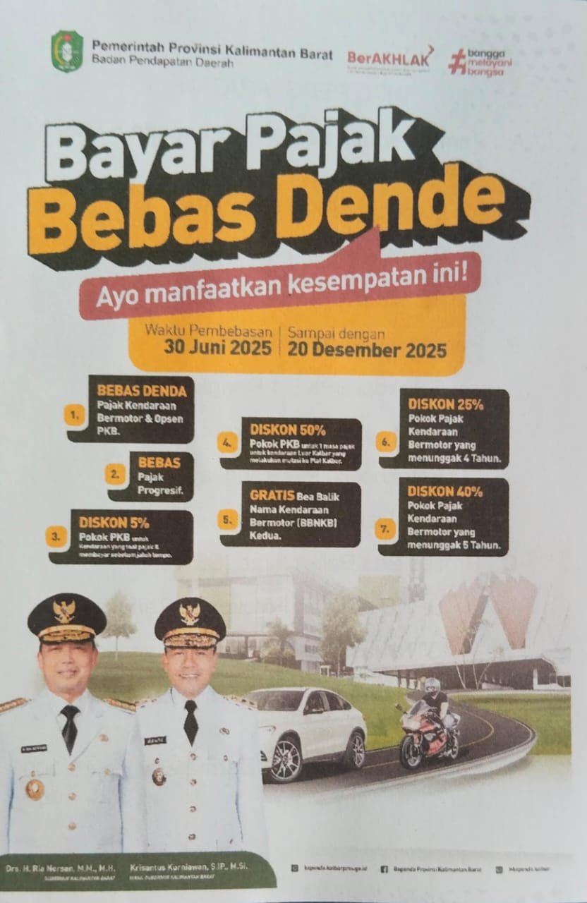 Dinas Pendapatan Daerah Provinsi Kalimantan Barat juga memberikan informasi bahwa masa tenggang pembayaran pajak bebas denda berlaku hingga 20 Desember 2025. Masyarakat yang belum membayar pajak dapat melakukan pembayaran melalui kantor pajak, atau melalui aplikasi resmi.