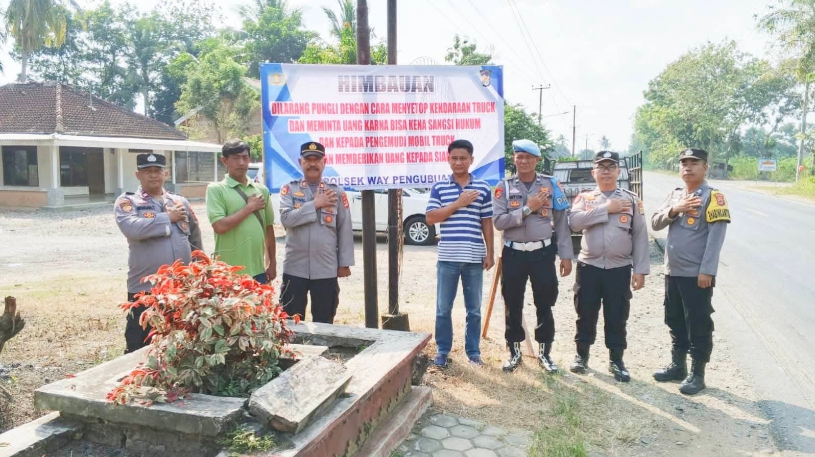 Kapolsek dan timnya menegaskan larangan melakukan pungli terhadap mobil truk yang melintas di wilayah hukum Polsek Way Pengubuan. Sebanyak dua banner dipasang sebagai bentuk edukasi visual yang mudah terlihat oleh masyarakat dan pengguna jalan.