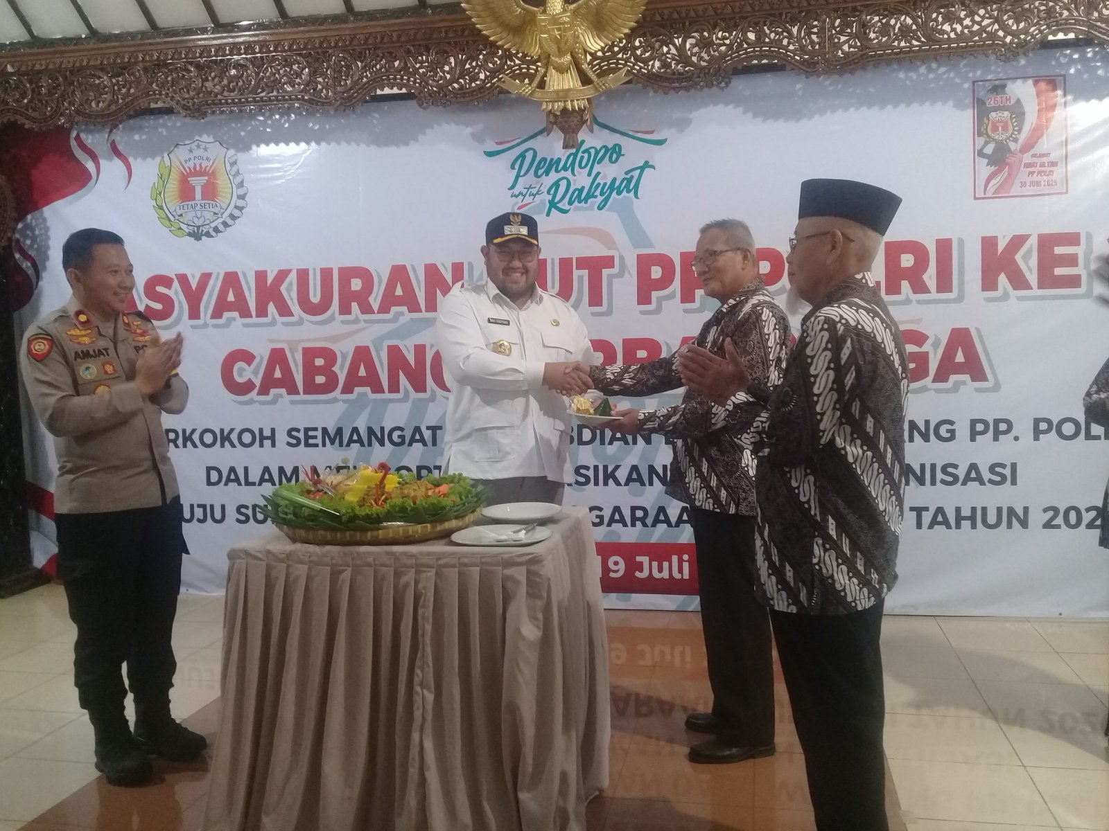Acara di lanjutkan dengan pemotongan tumpeng oeh Plt. Bupati Purbalingga Dimas Prasetyahani dan Wakapolres Purbalingga Kompol Agus Amjat masing-masing di berikan kepada Ketua PP Polri Cabang Purbalingga AF Sarpono dan sesepuh PP Polri.