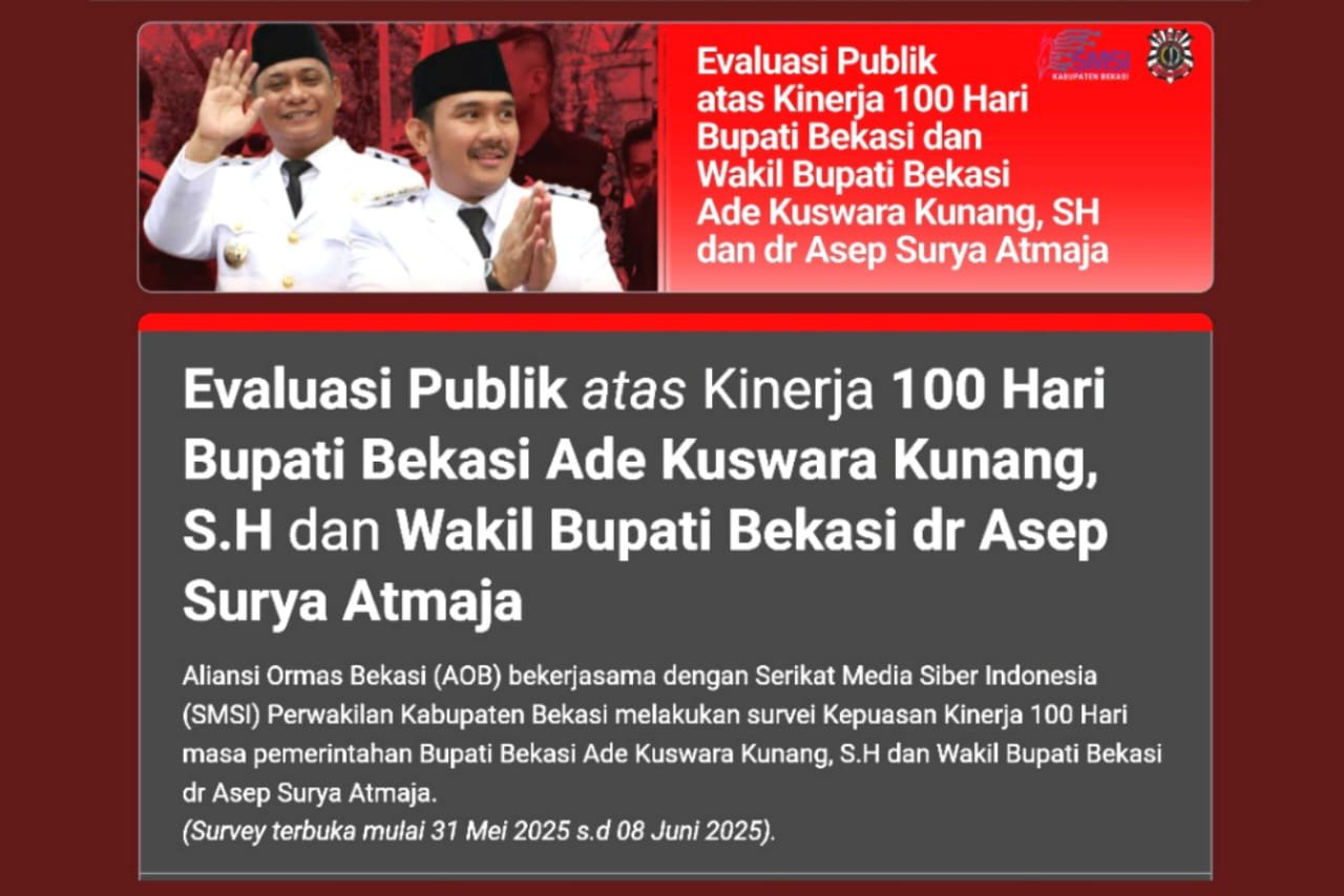 BEKASI, poskota.online – Aliansi Ormas Bekasi bekerjasama dengan Serikat Media Siber Indonesia (SMSI) perwakilan Kabupaten Bekasi membentuk tim litbang (penelitian dan pengembangan) untuk mengetahui tingkat opini dan kepuasan publik atas 100 hari kinerja Bupati Bekasi Ade Kuswara Kunang dan Wakil Bupati Bekasi dr Asep Surya Atmaja.