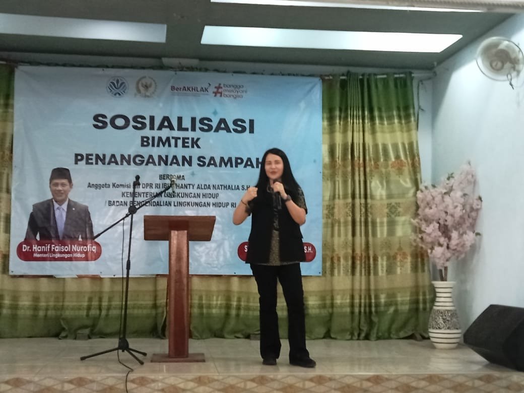 Bersama petugas KLH, Shanty Alda memberikan Bimbingan Teknis (Bimtek) penanggulangan sampah dan menyerahkan bantuan delapan unit sepeda motor roda tiga pengangkut sampah kepada masyarakat secara simbolis.