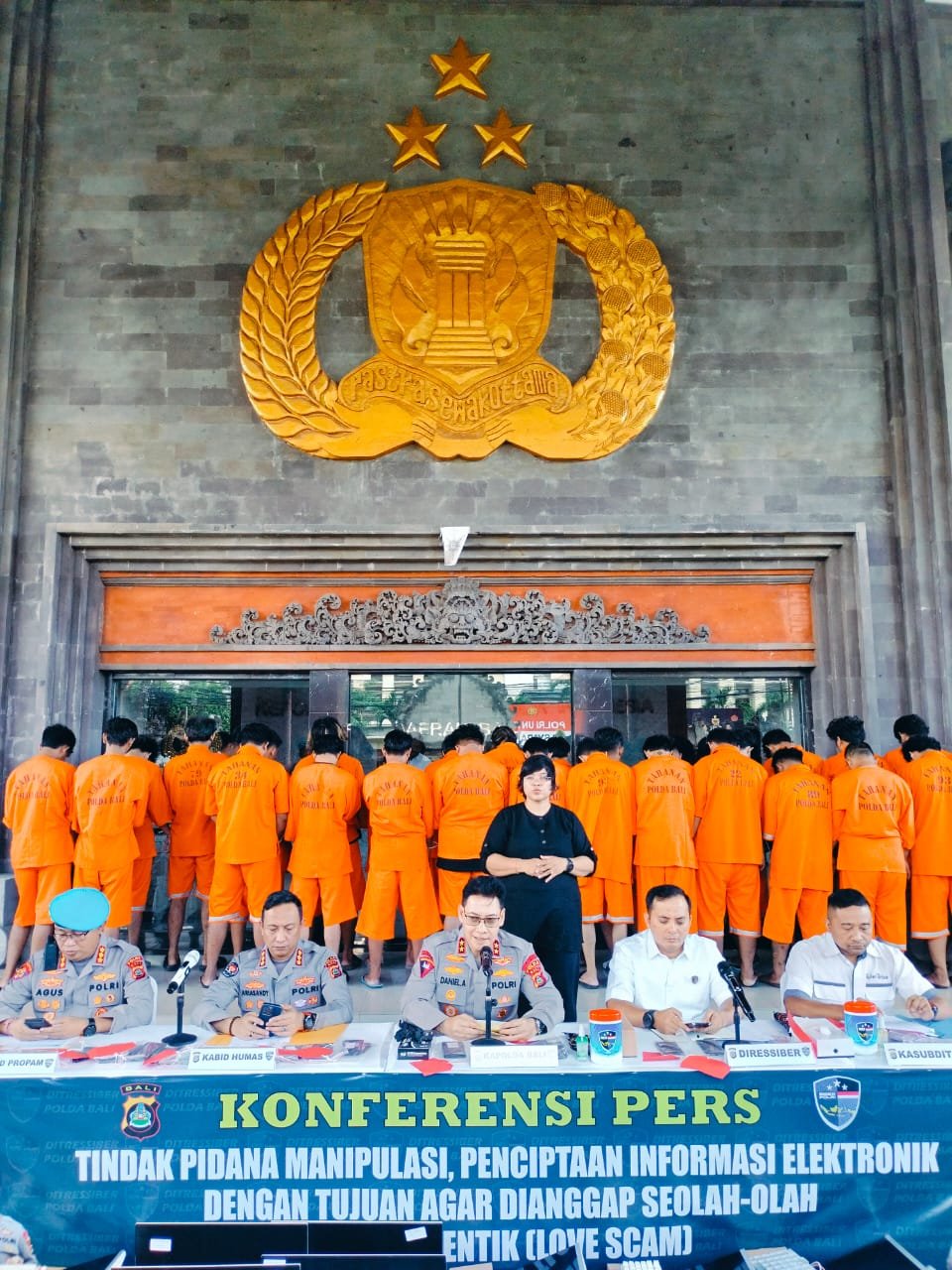 Bali, poskota.online – Kapolda Bali Irjen Pol Daniel Adityajaya S.H., S.I.K., M.Si., didampingi Kabid Humas Kombes Pol Ariasandy S.I.K., dan Dirressiber Kombes Pol Ranefli Dian Candra S.I.K., M.H., Kabid Propam Kombes Pol Ketut Agus Kusmayadi S.I.K., dan para Kasubdit Ditsiber saat konferensi pers di lobi Mapolda pada rabu 11 juni 2025, menerangkan keberhasilan Ditressiber Polda Bali dalam pengungkapan tindak pidana sindikat penipuan online dengan mengamankan 38 orang pelaku dari lima TKP.