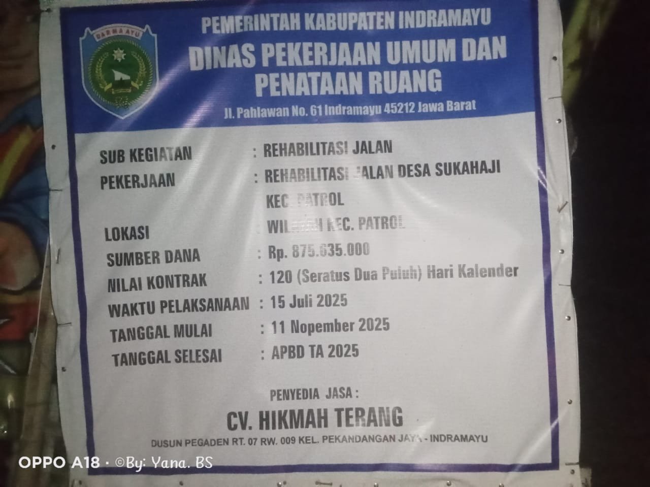 Pekerjaan ini Kecamatan Patrol kabupaten Indramayu yang di laksanakan oleh Cv. Hikmah Terang dengan peningkatan jalan Cor beton dengan panjang